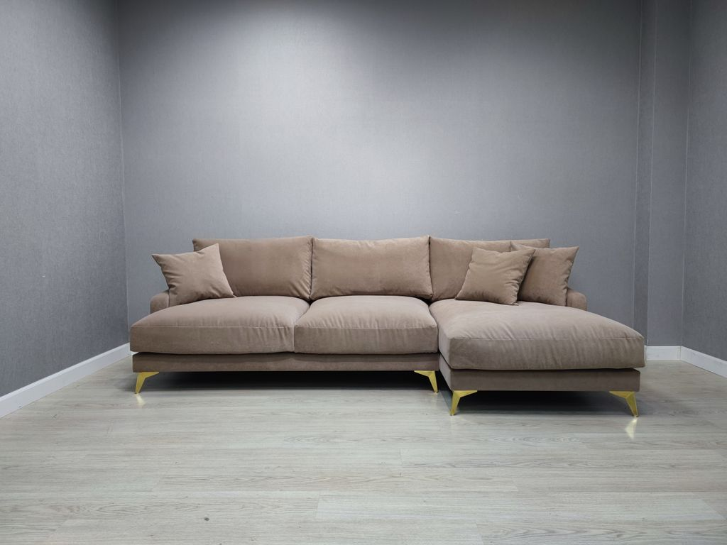 Строгие формы дивана, подчеркиваются изящными штрихами, в виде декоративным хромированным молдингом, в сочетании с хромированными ножками. Угловая модель с оттоманкой, позволит разместиться с комфортом всей семье.