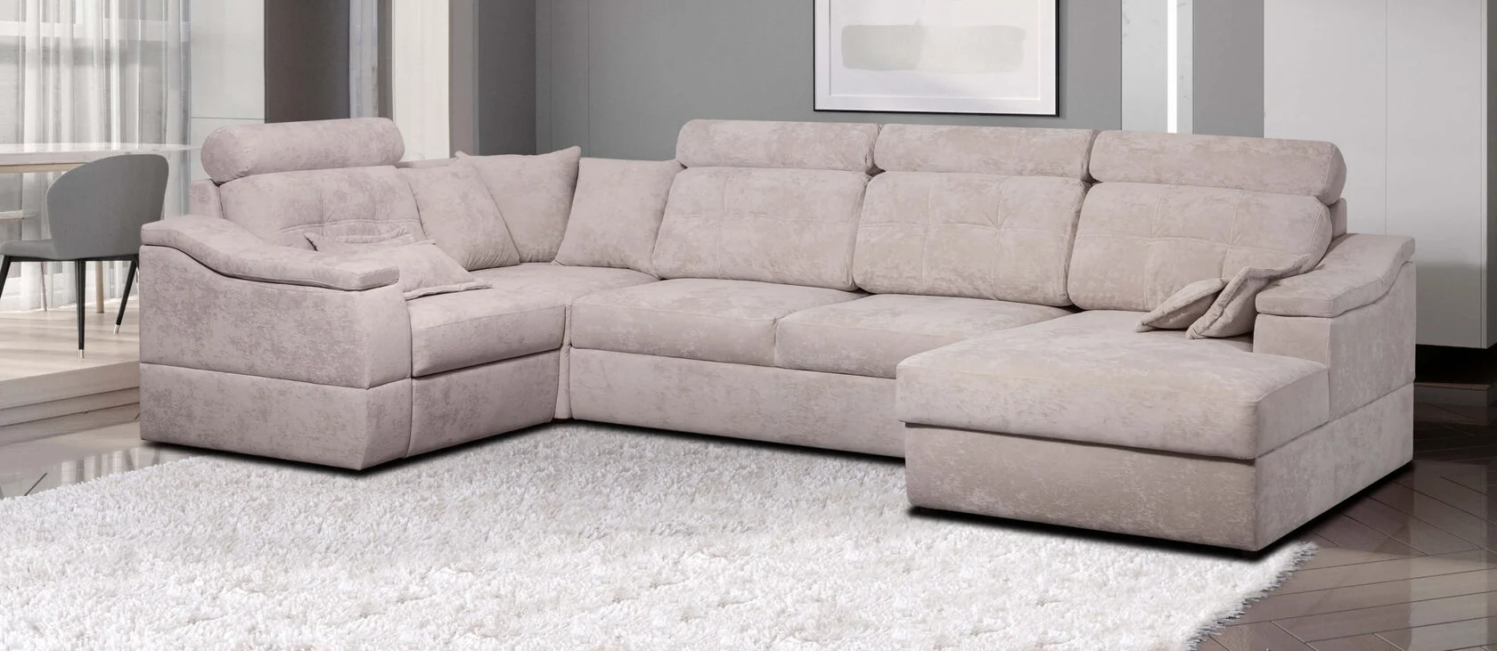 Просторный П-образный диван «Рич 11», является не только оригинальным способом зонирования комнаты, еще его можно быстро превратить в большую кровать. Линии прострочки, задают идеальную симметрию дивану, а мягкие подлокотники с удлиненными подушками и валиками для головы, покорят комфортом с первого взгляда.