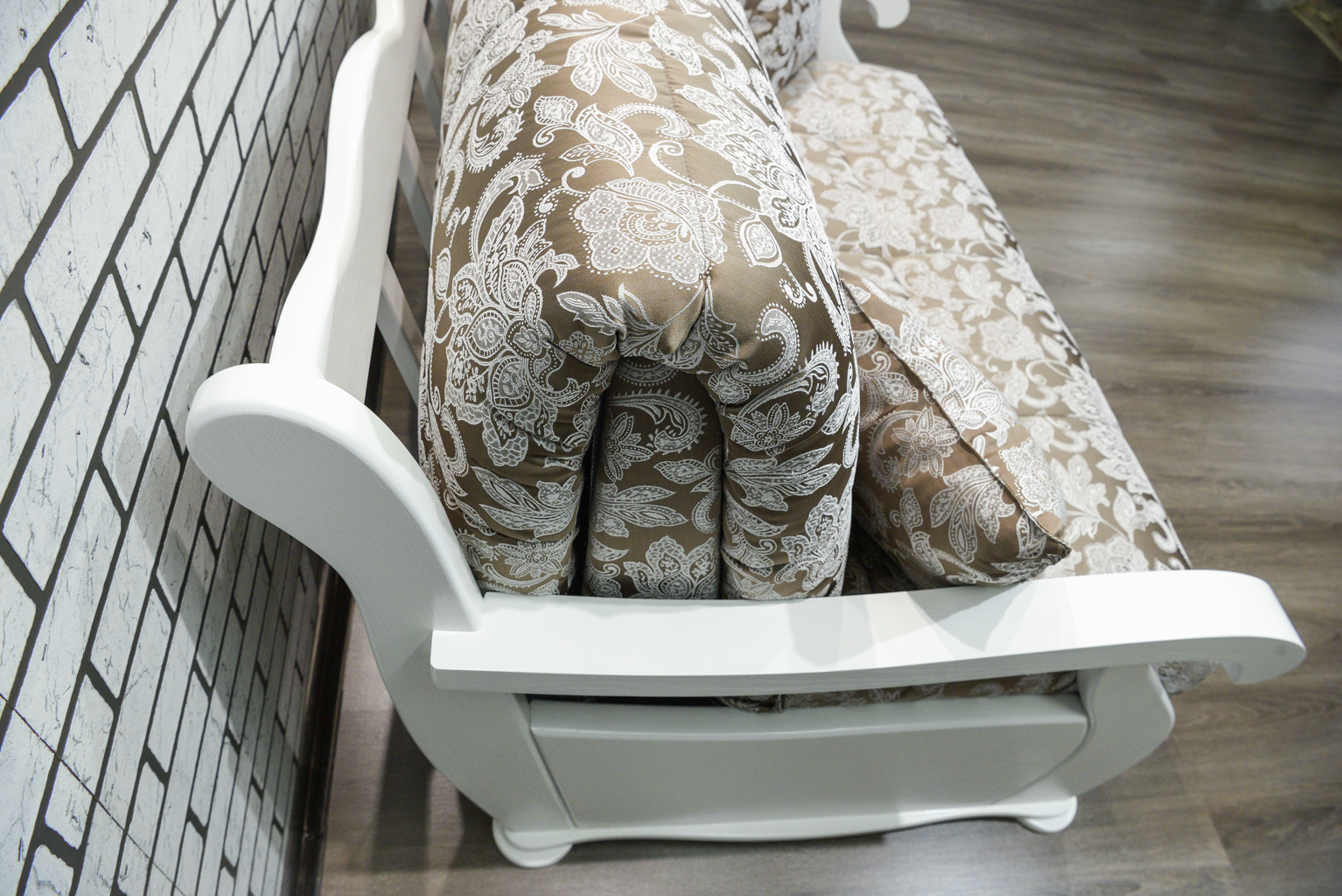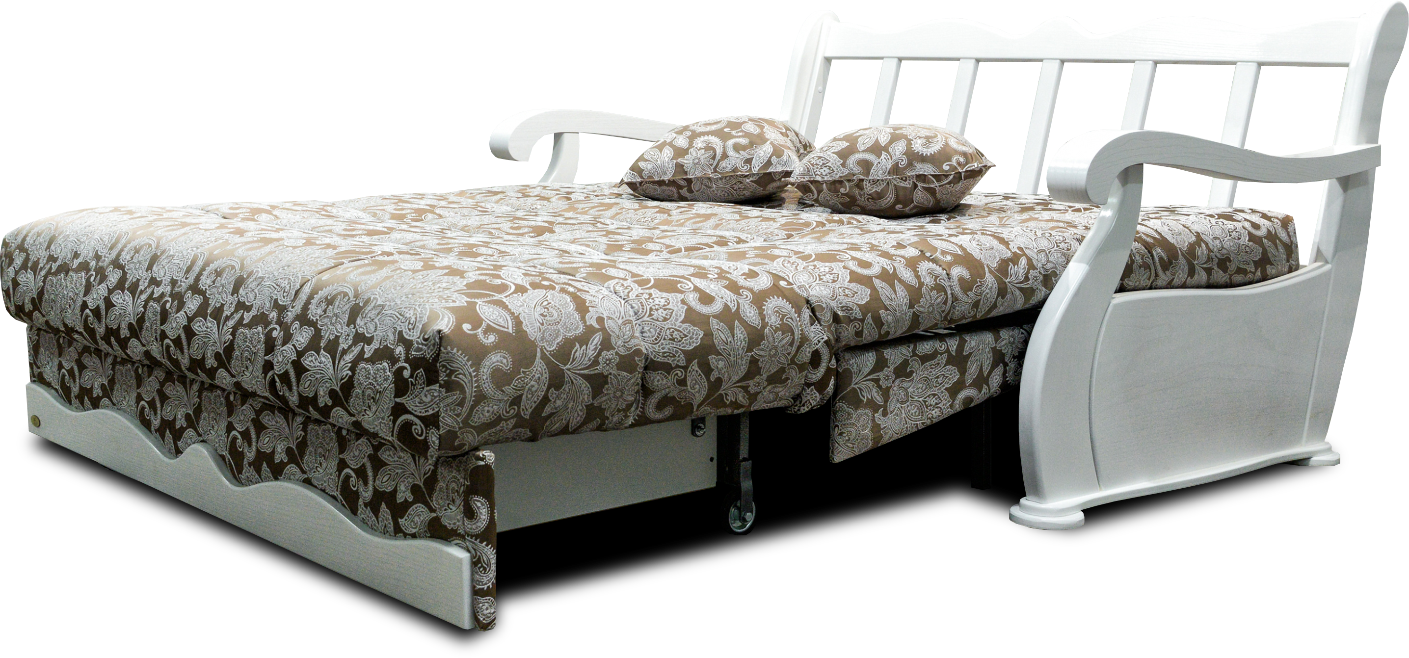 Этот диван-аккордеон привлекает внимание своим изысканным дизайном и функциональностью. Обивка выполнена из ткани с утонченным узором, который придает изделию уют и стиль. Орнамент включает нежные цветочные мотивы, создавая эффект легкости и гармонии в интерьере.