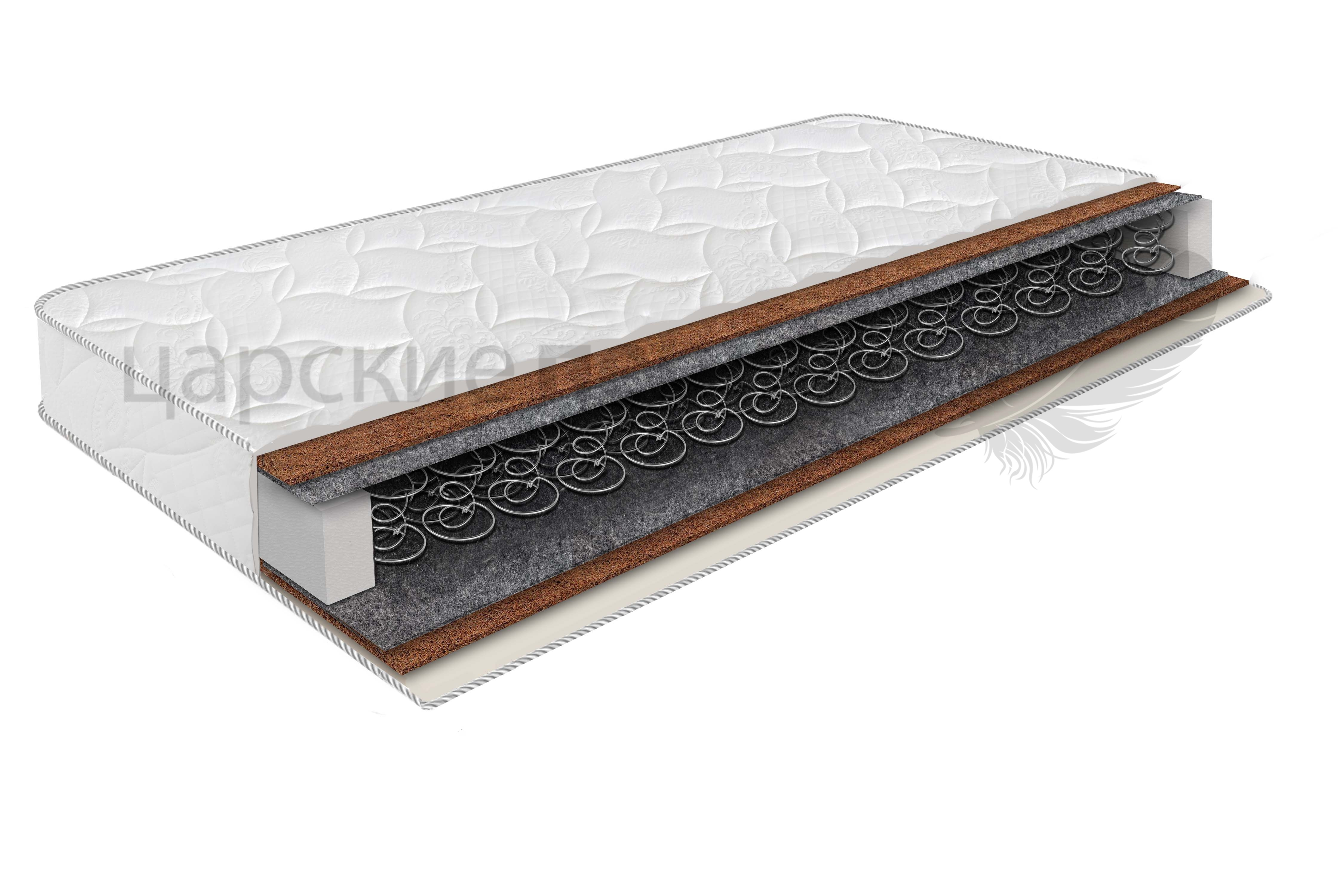Классический детский матрас на основе зависимых пружин типа Боннель с одинаковой степенью жесткости с обеих сторон в чехле из трикотажа, стеганного на синтепоне. Пружины изолированы термоскрепеленным войлоком, матрас обладает высокими вентиляционными свойствами благодаря использованию в составе матраса натуральной латексированной кокосовой койры. Данный матрас относится к категории жестких матрасов. Рекомендованная нагрузка до 90 кг.